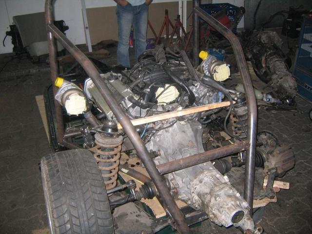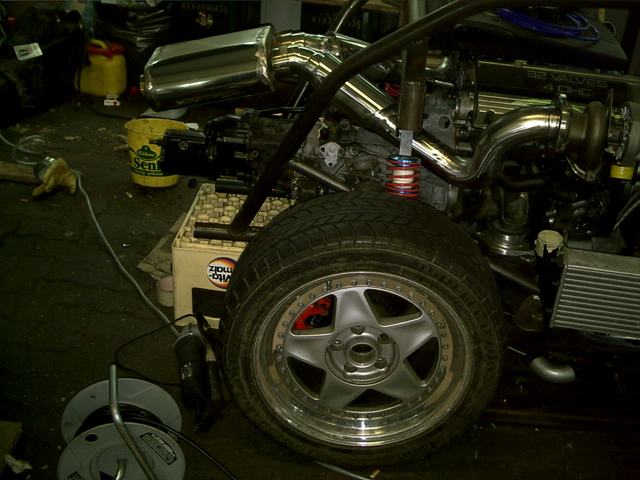 Hi Stinki, um deine Frage zu beantworten.Der Motor ist von einem Audi V8 ,also ein 8 Zylinder Motor mit 3.6 Liter Hubraum bestückt mit feinen sachen wie :8x Titan Pleulstangen,Rennlagerschalen,umgebohrte Hauptlagerböcke,8x Termalteake Kolben mit Kolbenboden Kühlung,Renn Einspritzanlage mit 4 Loch Bedüsung,Einzelzündanlage Frei Programmierbar wie die Einspritzung auch (Mit dem Laptop einfach ans Steuergerät und einstellen). Die Nockenwellen hat Spenna Motorsport Speziell für diesen Motor anfertigen lassen und zwar 4 Stück 2x Einlass 2x Auslass und sie sind im inneren nochmals extern einstellbar, 32 Große Ventiele,Köpfe Bearbeitet,große Ölpumpe (mehr Druck),die Turbolader sind von einem Porsche 993 Bi Turbo GT2 Phase zwei also schon die etwas grösseren.Verdichtung wurde auf 8:1 heruntergesetzt (normal c.a. 11:1) Getriebe ist von einem Audi RS4 (5ter Gang im Stahlgehäuse)Kupplung ist eine Angefertigte Aluschwungscheibe mit Stahllaufring und Torosionsgefederter Sintermetall Kupplungsscheibe mit Verstärktem Druckkorb aus dem Hause Sachs Engeneering Race Parts.Aufpuffanlage Made by LOCO hehe ,2x 77mm mit 200 Zeller Edelstahl Rennkats ,Endtopf Eigenbau aus Edelstahl.Ja dann haben wir nur noch 5 Kühler 1x Wasserkühler 1xÖlkühler 1x Getriebe Öl Kühler 2x Ladeluftkühler.